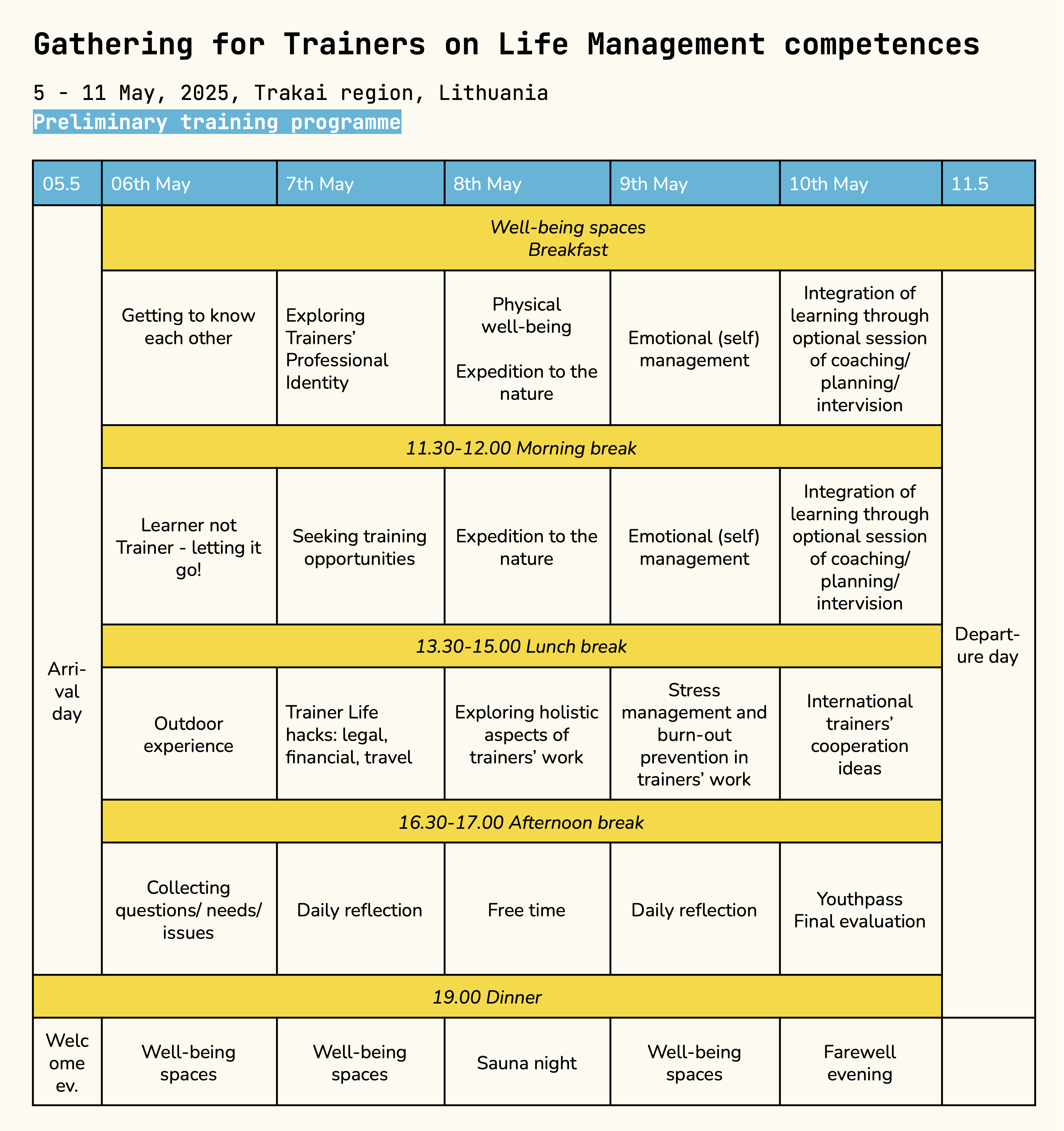 We’ll also share practices and insights from the trainers’ community, developed via the project “Holistic Trainer” by the International Youth Work Trainers Guild in cooperation with other training organisations.