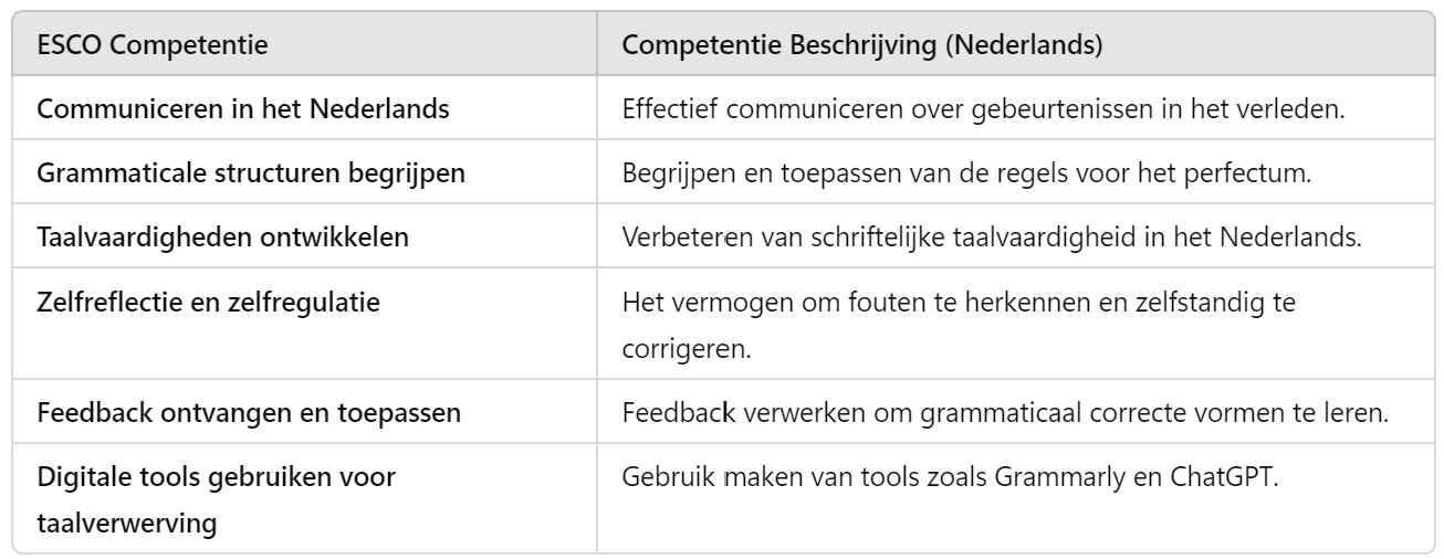 In deze opdracht leer je stap voor stap het perfectum (voltooide tijd) correct te gebruiken. Door zelf zinnen te schrijven, feedback te ontvangen en te herhalen, verbeter je je grammaticale vaardigheden en kun je deze tijdsvorm met vertrouwen toepassen. Laten we beginnen!