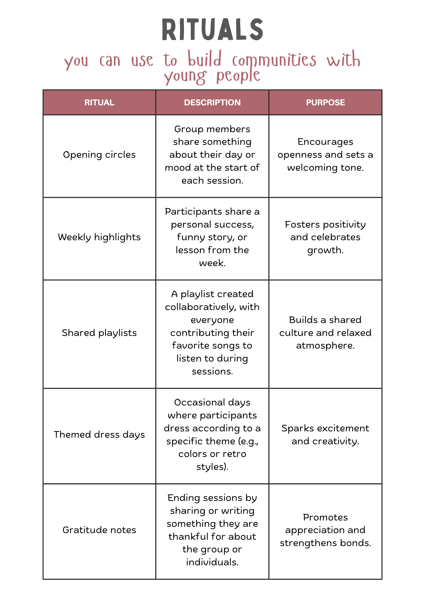 Share with us which community you’ve chosen, the ritual you’d like to introduce, and how you believe this ritual could impact the community.