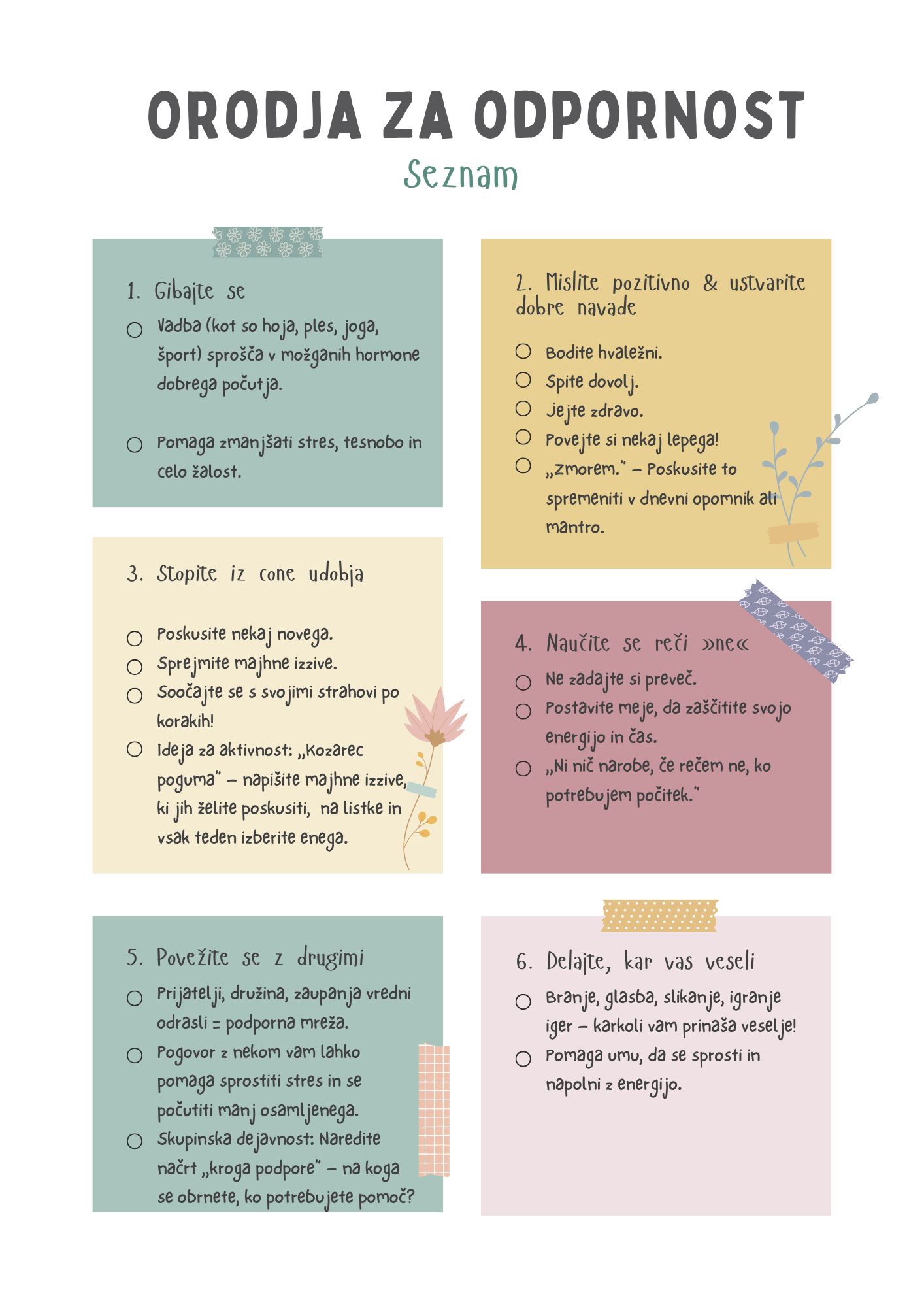 Odpornost pomeni, da se lahko po stresnih situacijah, težkih časih ali spremembah pobereš in nadaljuješ.Pomaga nam, da se spoprimemo s pritiskom, ostanemo mirni v težkih trenutkih in vztrajamo, tudi ko se nam zdi, da je težko.