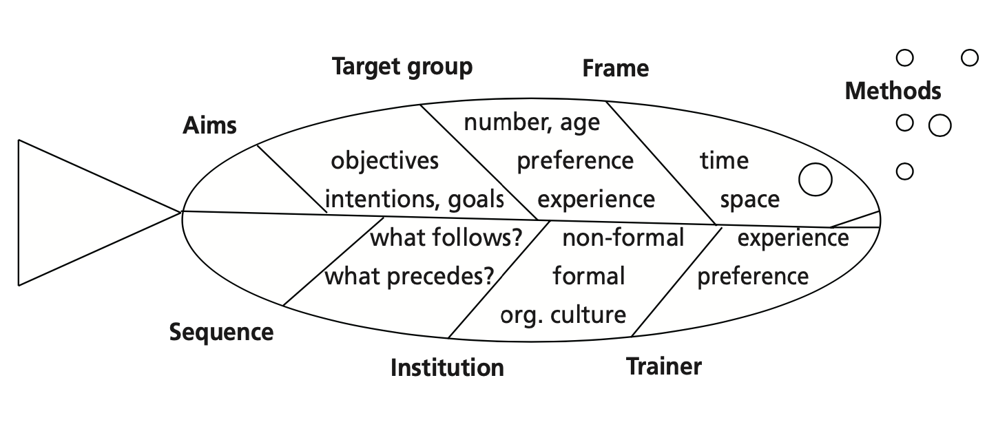 Bovenstaande is aangepast van de T-kit Training Essential, die een uitgebreid overzicht biedt van hoe leeractiviteiten te ontwerpen en methoden te kiezen. Zie het vismodel hieronder en download de volledige uitleg over hoe dit in de praktijk toe te passen.